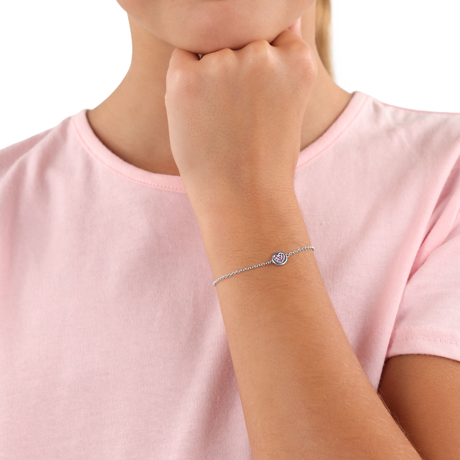 Süßes Armband mit rundem Anhänger für Mädchen von Prinzessin Lillifee. Das Armband ist vielseitig kombinierbar und sorgt für eine extra Portion Glitzer am Handgelenk. Die Armkette besteht aus hochwertigem 925 Sterling Silber, wodurch deine kleine Prinzessin noch länger Freude an dem neuen Accessoire haben wird. Die Zirkoniasteine (synth.) sind in Herz-Form auf dem Anhänger angeordnet und bringen das Schmuckstück zum Funkeln. Das Mädchenarmband ist zwischen 12 und 15 cm individuell längenverstellbar und wächst hierdurch mit. Für einen sicheren Halt und ein einfaches An- und Ablegen sorgt ein praktischer Karabinerverschluss. Das Armband für Kinder lässt sich gerne mit weiteren Schmuckstücken kombinieren, beispielsweise mit den passenden Ohrsteckern oder der stimmigen Halskette.